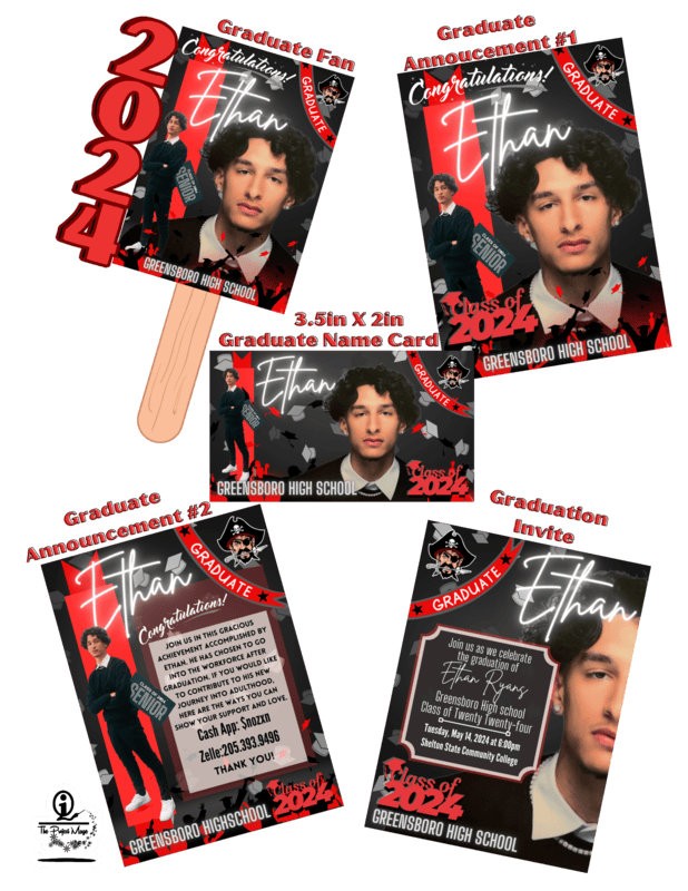Graduation Pack. Includes 5 Fans. 40 Invite or Announcement Cards( You may split 20+20). 40 Name Card(3.5inx2in). Envelopes included.